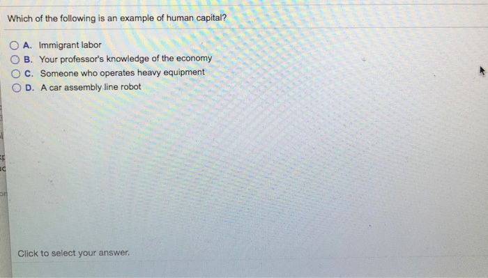 Which of the following is an example of human capital. Which of the following is an example of human capital a. The amount you get paid each week to work at the library O c.